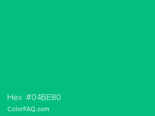 Hex #04be80 Color is a normal green color and the nearest color is Green Munsell #00a877. Hex code #04be80 and RGB value is rgb(4,190,128). In RGB color space, this color is composed of 2% red, 75% green, 50% blue, In CMYK color space, this color is composed of 98% cyan, 0% magenta, 33% yellow , 25% black , In HSL color space, this color has a hue angle of 160° , 96% saturation and 38% lightness.