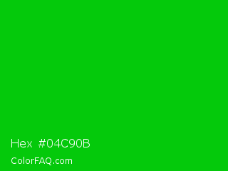 Hex #04c90b Color is a normal green color and the nearest color is Vivid Malachite #00cc33. Hex code #04c90b and RGB value is rgb(4,201,11). In RGB color space, this color is composed of 2% red, 79% green, 4% blue, In CMYK color space, this color is composed of 98% cyan, 0% magenta, 95% yellow , 21% black , In HSL color space, this color has a hue angle of 122° , 96% saturation and 40% lightness.