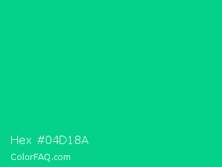 Hex #04d18a Color is a normal green color and the nearest color is Caribbean Green #00cc99. Hex code #04d18a and RGB value is rgb(4,209,138). In RGB color space, this color is composed of 2% red, 82% green, 54% blue, In CMYK color space, this color is composed of 98% cyan, 0% magenta, 34% yellow , 18% black , In HSL color space, this color has a hue angle of 159° , 96% saturation and 42% lightness.