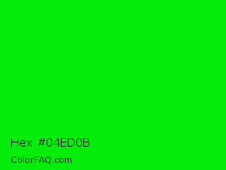 Hex #04ed0b Color is a normal green color and the nearest color is Green #00ff00. Hex code #04ed0b and RGB value is rgb(4,237,11). In RGB color space, this color is composed of 2% red, 93% green, 4% blue, In CMYK color space, this color is composed of 98% cyan, 0% magenta, 95% yellow , 7% black , In HSL color space, this color has a hue angle of 122° , 97% saturation and 47% lightness.
