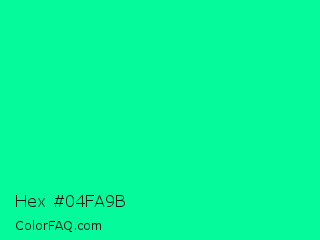 Hex #04fa9b Color is a normal green color and the nearest color is Medium Spring Green #00fa9a. Hex code #04fa9b and RGB value is rgb(4,250,155). In RGB color space, this color is composed of 2% red, 98% green, 61% blue, In CMYK color space, this color is composed of 98% cyan, 0% magenta, 38% yellow , 2% black , In HSL color space, this color has a hue angle of 157° , 97% saturation and 50% lightness.