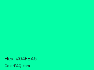 Hex #04fea6 Color is a normal green color and the nearest color is Medium Spring Green #00fa9a. Hex code #04fea6 and RGB value is rgb(4,254,166). In RGB color space, this color is composed of 2% red, 100% green, 65% blue, In CMYK color space, this color is composed of 98% cyan, 0% magenta, 35% yellow , 0% black , In HSL color space, this color has a hue angle of 159° , 99% saturation and 51% lightness.