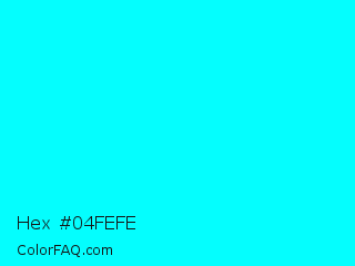 Hex #04fefe Color is a normal cyan color and the nearest color is Cyan / Aqua #00ffff. Hex code #04fefe and RGB value is rgb(4,254,254). In RGB color space, this color is composed of 2% red, 100% green, 100% blue, In CMYK color space, this color is composed of 98% cyan, 0% magenta, 0% yellow , 0% black , In HSL color space, this color has a hue angle of 180° , 99% saturation and 51% lightness.