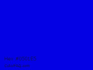 Hex #0501e5 Color is a normal indigo color and the nearest color is Medium Blue #0000cd. Hex code #0501e5 and RGB value is rgb(5,1,229). In RGB color space, this color is composed of 2% red, 0% green, 90% blue, In CMYK color space, this color is composed of 98% cyan, 100% magenta, 0% yellow , 10% black , In HSL color space, this color has a hue angle of 241° , 99% saturation and 45% lightness.