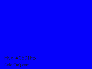 Hex #0501fb Color is a normal indigo color and the nearest color is Blue #0000ff. Hex code #0501fb and RGB value is rgb(5,1,251). In RGB color space, this color is composed of 2% red, 0% green, 98% blue, In CMYK color space, this color is composed of 98% cyan, 100% magenta, 0% yellow , 2% black , In HSL color space, this color has a hue angle of 241° , 99% saturation and 49% lightness.