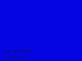 Hex #0505e4 Color is a normal blue color and the nearest color is Medium Blue #0000cd. Hex code #0505e4 and RGB value is rgb(5,5,228). In RGB color space, this color is composed of 2% red, 2% green, 89% blue, In CMYK color space, this color is composed of 98% cyan, 98% magenta, 0% yellow , 11% black , In HSL color space, this color has a hue angle of 240° , 96% saturation and 46% lightness.