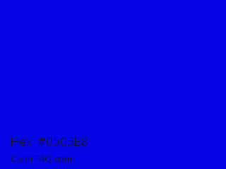 Hex #0505e8 Color is a normal blue color and the nearest color is Blue #0000ff. Hex code #0505e8 and RGB value is rgb(5,5,232). In RGB color space, this color is composed of 2% red, 2% green, 91% blue, In CMYK color space, this color is composed of 98% cyan, 98% magenta, 0% yellow , 9% black , In HSL color space, this color has a hue angle of 240° , 96% saturation and 46% lightness.