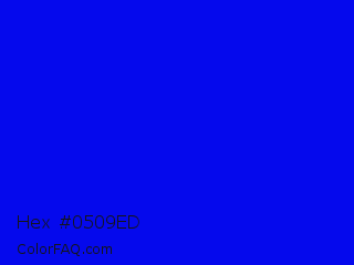 Hex #0509ed Color is a normal blue color and the nearest color is Blue #0000ff. Hex code #0509ed and RGB value is rgb(5,9,237). In RGB color space, this color is composed of 2% red, 4% green, 93% blue, In CMYK color space, this color is composed of 98% cyan, 96% magenta, 0% yellow , 7% black , In HSL color space, this color has a hue angle of 239° , 96% saturation and 47% lightness.