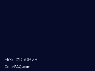 Hex #050b28 Color is a almost black blue color and the nearest color is Black Pearl #041322. Hex code #050b28 and RGB value is rgb(5,11,40). In RGB color space, this color is composed of 2% red, 4% green, 16% blue, In CMYK color space, this color is composed of 88% cyan, 73% magenta, 0% yellow , 84% black , In HSL color space, this color has a hue angle of 230° , 78% saturation and 9% lightness.