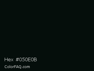 Hex #050e0b Color is a almost black green color and the nearest color is Cod Gray #0b0b0b. Hex code #050e0b and RGB value is rgb(5,14,11). In RGB color space, this color is composed of 2% red, 5% green, 4% blue, In CMYK color space, this color is composed of 64% cyan, 0% magenta, 21% yellow , 95% black , In HSL color space, this color has a hue angle of 160° , 47% saturation and 4% lightness.