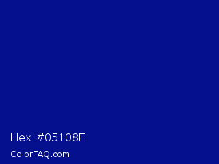 Hex #05108e Color is a dark blue color and the nearest color is Phthalo Blue #000f89. Hex code #05108e and RGB value is rgb(5,16,142). In RGB color space, this color is composed of 2% red, 6% green, 56% blue, In CMYK color space, this color is composed of 96% cyan, 89% magenta, 0% yellow , 44% black , In HSL color space, this color has a hue angle of 235° , 93% saturation and 29% lightness.
