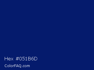 Hex #051b6d Color is a very dark blue color and the nearest color is Royal Blue #002366. Hex code #051b6d and RGB value is rgb(5,27,109). In RGB color space, this color is composed of 2% red, 11% green, 43% blue, In CMYK color space, this color is composed of 95% cyan, 75% magenta, 0% yellow , 57% black , In HSL color space, this color has a hue angle of 227° , 91% saturation and 22% lightness.