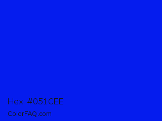 Hex #051cee Color is a normal blue color and the nearest color is Bluebonnet #1c1cf0. Hex code #051cee and RGB value is rgb(5,28,238). In RGB color space, this color is composed of 2% red, 11% green, 93% blue, In CMYK color space, this color is composed of 98% cyan, 88% magenta, 0% yellow , 7% black , In HSL color space, this color has a hue angle of 234° , 96% saturation and 48% lightness.