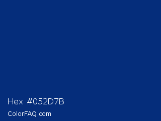 Hex #052d7b Color is a dark blue color and the nearest color is Catalina Blue #062a78. Hex code #052d7b and RGB value is rgb(5,45,123). In RGB color space, this color is composed of 2% red, 18% green, 48% blue, In CMYK color space, this color is composed of 96% cyan, 63% magenta, 0% yellow , 52% black , In HSL color space, this color has a hue angle of 220° , 92% saturation and 25% lightness.