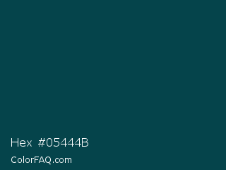 Hex #05444b Color is a very dark cyan color and the nearest color is Sherpa Blue #004950. Hex code #05444b and RGB value is rgb(5,68,75). In RGB color space, this color is composed of 2% red, 27% green, 29% blue, In CMYK color space, this color is composed of 93% cyan, 9% magenta, 0% yellow , 71% black , In HSL color space, this color has a hue angle of 186° , 88% saturation and 16% lightness.