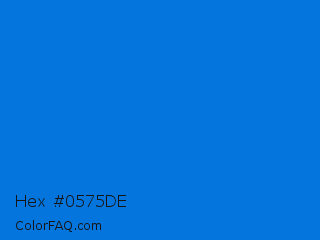 Hex #0575de Color is a normal blue color and the nearest color is True Blue #0073cf. Hex code #0575de and RGB value is rgb(5,117,222). In RGB color space, this color is composed of 2% red, 46% green, 87% blue, In CMYK color space, this color is composed of 98% cyan, 47% magenta, 0% yellow , 13% black , In HSL color space, this color has a hue angle of 209° , 96% saturation and 45% lightness.