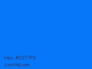 Hex #0577f9 Color is a normal blue color and the nearest color is Brandeis Blue #0070ff. Hex code #0577f9 and RGB value is rgb(5,119,249). In RGB color space, this color is composed of 2% red, 47% green, 98% blue, In CMYK color space, this color is composed of 98% cyan, 52% magenta, 0% yellow , 2% black , In HSL color space, this color has a hue angle of 212° , 96% saturation and 50% lightness.