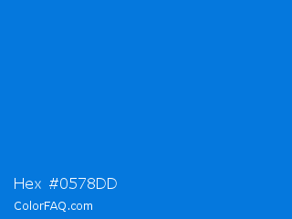 Hex #0578dd Color is a normal blue color and the nearest color is True Blue #0073cf. Hex code #0578dd and RGB value is rgb(5,120,221). In RGB color space, this color is composed of 2% red, 47% green, 87% blue, In CMYK color space, this color is composed of 98% cyan, 46% magenta, 0% yellow , 13% black , In HSL color space, this color has a hue angle of 208° , 96% saturation and 44% lightness.