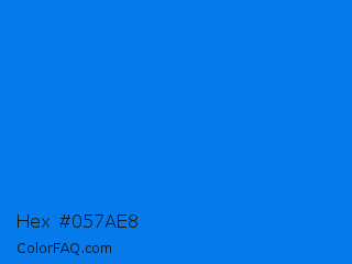 Hex #057ae8 Color is a normal blue color and the nearest color is Azure Radiance #007fff. Hex code #057ae8 and RGB value is rgb(5,122,232). In RGB color space, this color is composed of 2% red, 48% green, 91% blue, In CMYK color space, this color is composed of 98% cyan, 47% magenta, 0% yellow , 9% black , In HSL color space, this color has a hue angle of 209° , 96% saturation and 46% lightness.