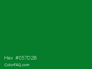 Hex #057d2b Color is a dark green color and the nearest color is La Salle Green #087830. Hex code #057d2b and RGB value is rgb(5,125,43). In RGB color space, this color is composed of 2% red, 49% green, 17% blue, In CMYK color space, this color is composed of 96% cyan, 0% magenta, 66% yellow , 51% black , In HSL color space, this color has a hue angle of 139° , 92% saturation and 25% lightness.