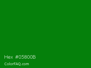 Hex #05800b Color is a dark green color and the nearest color is Office Green #008000. Hex code #05800b and RGB value is rgb(5,128,11). In RGB color space, this color is composed of 2% red, 50% green, 4% blue, In CMYK color space, this color is composed of 96% cyan, 0% magenta, 91% yellow , 50% black , In HSL color space, this color has a hue angle of 123° , 92% saturation and 26% lightness.