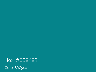 Hex #05848b Color is a dark cyan color and the nearest color is Metallic Seaweed #0a7e8c. Hex code #05848b and RGB value is rgb(5,132,139). In RGB color space, this color is composed of 2% red, 52% green, 55% blue, In CMYK color space, this color is composed of 96% cyan, 5% magenta, 0% yellow , 45% black , In HSL color space, this color has a hue angle of 183° , 93% saturation and 28% lightness.