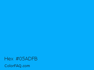 Hex #05adfb Color is a normal blue color and the nearest color is Blue Bolt #00b9fb. Hex code #05adfb and RGB value is rgb(5,173,251). In RGB color space, this color is composed of 2% red, 68% green, 98% blue, In CMYK color space, this color is composed of 98% cyan, 31% magenta, 0% yellow , 2% black , In HSL color space, this color has a hue angle of 199° , 97% saturation and 50% lightness.