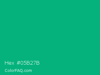Hex #05b27b Color is a normal green color and the nearest color is Green Munsell #00a877. Hex code #05b27b and RGB value is rgb(5,178,123). In RGB color space, this color is composed of 2% red, 70% green, 48% blue, In CMYK color space, this color is composed of 97% cyan, 0% magenta, 31% yellow , 30% black , In HSL color space, this color has a hue angle of 161° , 95% saturation and 36% lightness.