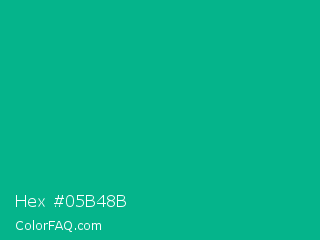 Hex #05b48b Color is a normal cyan color and the nearest color is Persian Green #00a693. Hex code #05b48b and RGB value is rgb(5,180,139). In RGB color space, this color is composed of 2% red, 71% green, 55% blue, In CMYK color space, this color is composed of 97% cyan, 0% magenta, 23% yellow , 29% black , In HSL color space, this color has a hue angle of 166° , 95% saturation and 36% lightness.