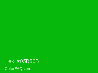 Hex #05b80b Color is a normal green color and the nearest color is Islamic Green #009000. Hex code #05b80b and RGB value is rgb(5,184,11). In RGB color space, this color is composed of 2% red, 72% green, 4% blue, In CMYK color space, this color is composed of 97% cyan, 0% magenta, 94% yellow , 28% black , In HSL color space, this color has a hue angle of 122° , 95% saturation and 37% lightness.