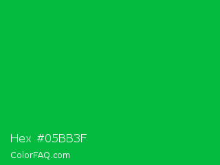 Hex #05bb3f Color is a normal green color and the nearest color is Dark Pastel Green #03c03c. Hex code #05bb3f and RGB value is rgb(5,187,63). In RGB color space, this color is composed of 2% red, 73% green, 25% blue, In CMYK color space, this color is composed of 97% cyan, 0% magenta, 66% yellow , 27% black , In HSL color space, this color has a hue angle of 139° , 95% saturation and 38% lightness.