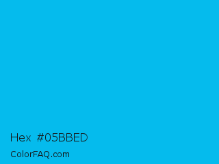 Hex #05bbed Color is a normal cyan color and the nearest color is Cyan Process #00b7eb. Hex code #05bbed and RGB value is rgb(5,187,237). In RGB color space, this color is composed of 2% red, 73% green, 93% blue, In CMYK color space, this color is composed of 98% cyan, 21% magenta, 0% yellow , 7% black , In HSL color space, this color has a hue angle of 193° , 96% saturation and 47% lightness.