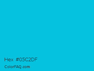 Hex #05c2df Color is a normal cyan color and the nearest color is Cyan Process #00b7eb. Hex code #05c2df and RGB value is rgb(5,194,223). In RGB color space, this color is composed of 2% red, 76% green, 87% blue, In CMYK color space, this color is composed of 98% cyan, 13% magenta, 0% yellow , 13% black , In HSL color space, this color has a hue angle of 188° , 96% saturation and 45% lightness.