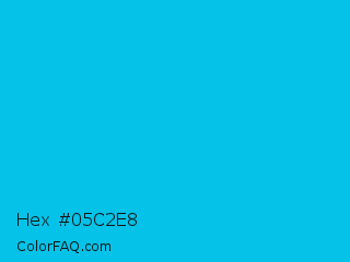 Hex #05c2e8 Color is a normal cyan color and the nearest color is Cyan Process #00b7eb. Hex code #05c2e8 and RGB value is rgb(5,194,232). In RGB color space, this color is composed of 2% red, 76% green, 91% blue, In CMYK color space, this color is composed of 98% cyan, 16% magenta, 0% yellow , 9% black , In HSL color space, this color has a hue angle of 190° , 96% saturation and 46% lightness.