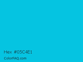 Hex #05c4e1 Color is a normal cyan color and the nearest color is Cyan Process #00b7eb. Hex code #05c4e1 and RGB value is rgb(5,196,225). In RGB color space, this color is composed of 2% red, 77% green, 88% blue, In CMYK color space, this color is composed of 98% cyan, 13% magenta, 0% yellow , 12% black , In HSL color space, this color has a hue angle of 188° , 96% saturation and 45% lightness.