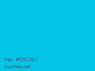 Hex #05c5e7 Color is a normal cyan color and the nearest color is Cyan Process #00b7eb. Hex code #05c5e7 and RGB value is rgb(5,197,231). In RGB color space, this color is composed of 2% red, 77% green, 91% blue, In CMYK color space, this color is composed of 98% cyan, 15% magenta, 0% yellow , 9% black , In HSL color space, this color has a hue angle of 189° , 96% saturation and 46% lightness.