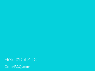 Hex #05d1dc Color is a normal cyan color and the nearest color is Dark Turquoise #00ced1. Hex code #05d1dc and RGB value is rgb(5,209,220). In RGB color space, this color is composed of 2% red, 82% green, 86% blue, In CMYK color space, this color is composed of 98% cyan, 5% magenta, 0% yellow , 14% black , In HSL color space, this color has a hue angle of 183° , 96% saturation and 44% lightness.