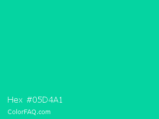 Hex #05d4a1 Color is a normal cyan color and the nearest color is Caribbean Green #00cc99. Hex code #05d4a1 and RGB value is rgb(5,212,161). In RGB color space, this color is composed of 2% red, 83% green, 63% blue, In CMYK color space, this color is composed of 98% cyan, 0% magenta, 24% yellow , 17% black , In HSL color space, this color has a hue angle of 165° , 95% saturation and 43% lightness.