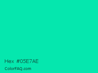 Hex #05e7ae Color is a normal cyan color and the nearest color is Medium Spring Green #00fa9a. Hex code #05e7ae and RGB value is rgb(5,231,174). In RGB color space, this color is composed of 2% red, 91% green, 68% blue, In CMYK color space, this color is composed of 98% cyan, 0% magenta, 25% yellow , 9% black , In HSL color space, this color has a hue angle of 165° , 96% saturation and 46% lightness.