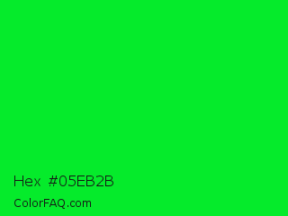 Hex #05eb2b Color is a normal green color and the nearest color is Vivid Malachite #00cc33. Hex code #05eb2b and RGB value is rgb(5,235,43). In RGB color space, this color is composed of 2% red, 92% green, 17% blue, In CMYK color space, this color is composed of 98% cyan, 0% magenta, 82% yellow , 8% black , In HSL color space, this color has a hue angle of 130° , 96% saturation and 47% lightness.