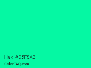 Hex #05f8a3 Color is a normal green color and the nearest color is Medium Spring Green #00fa9a. Hex code #05f8a3 and RGB value is rgb(5,248,163). In RGB color space, this color is composed of 2% red, 97% green, 64% blue, In CMYK color space, this color is composed of 98% cyan, 0% magenta, 34% yellow , 3% black , In HSL color space, this color has a hue angle of 159° , 96% saturation and 50% lightness.