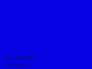 Hex #0602e3 Color is a normal indigo color and the nearest color is Medium Blue #0000cd. Hex code #0602e3 and RGB value is rgb(6,2,227). In RGB color space, this color is composed of 2% red, 1% green, 89% blue, In CMYK color space, this color is composed of 97% cyan, 99% magenta, 0% yellow , 11% black , In HSL color space, this color has a hue angle of 241° , 98% saturation and 45% lightness.
