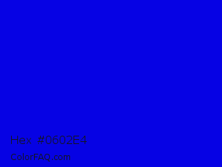 Hex #0602e4 Color is a normal indigo color and the nearest color is Medium Blue #0000cd. Hex code #0602e4 and RGB value is rgb(6,2,228). In RGB color space, this color is composed of 2% red, 1% green, 89% blue, In CMYK color space, this color is composed of 97% cyan, 99% magenta, 0% yellow , 11% black , In HSL color space, this color has a hue angle of 241° , 98% saturation and 45% lightness.
