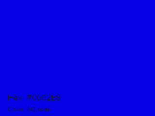 Hex #0602e8 Color is a normal indigo color and the nearest color is Blue #0000ff. Hex code #0602e8 and RGB value is rgb(6,2,232). In RGB color space, this color is composed of 2% red, 1% green, 91% blue, In CMYK color space, this color is composed of 97% cyan, 99% magenta, 0% yellow , 9% black , In HSL color space, this color has a hue angle of 241° , 98% saturation and 46% lightness.
