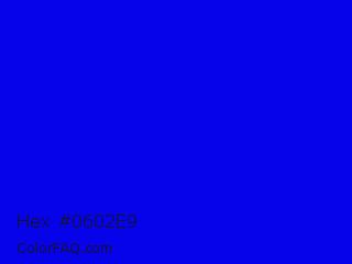 Hex #0602e9 Color is a normal indigo color and the nearest color is Blue #0000ff. Hex code #0602e9 and RGB value is rgb(6,2,233). In RGB color space, this color is composed of 2% red, 1% green, 91% blue, In CMYK color space, this color is composed of 97% cyan, 99% magenta, 0% yellow , 9% black , In HSL color space, this color has a hue angle of 241° , 98% saturation and 46% lightness.