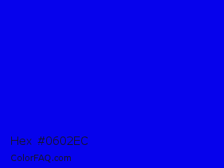 Hex #0602ec Color is a normal indigo color and the nearest color is Blue #0000ff. Hex code #0602ec and RGB value is rgb(6,2,236). In RGB color space, this color is composed of 2% red, 1% green, 93% blue, In CMYK color space, this color is composed of 97% cyan, 99% magenta, 0% yellow , 7% black , In HSL color space, this color has a hue angle of 241° , 98% saturation and 47% lightness.