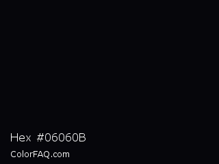 Hex #06060b Color is a almost black blue color and the nearest color is Cod Gray #0b0b0b. Hex code #06060b and RGB value is rgb(6,6,11). In RGB color space, this color is composed of 2% red, 2% green, 4% blue, In CMYK color space, this color is composed of 45% cyan, 45% magenta, 0% yellow , 96% black , In HSL color space, this color has a hue angle of 240° , 29% saturation and 3% lightness.