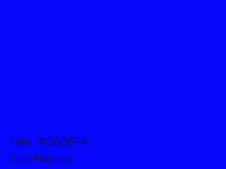 Hex #0606fa Color is a normal blue color and the nearest color is Blue #0000ff. Hex code #0606fa and RGB value is rgb(6,6,250). In RGB color space, this color is composed of 2% red, 2% green, 98% blue, In CMYK color space, this color is composed of 98% cyan, 98% magenta, 0% yellow , 2% black , In HSL color space, this color has a hue angle of 240° , 96% saturation and 50% lightness.