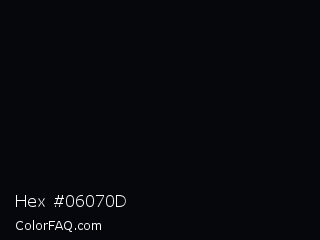 Hex #06070d Color is a almost black blue color and the nearest color is Cod Gray #0b0b0b. Hex code #06070d and RGB value is rgb(6,7,13). In RGB color space, this color is composed of 2% red, 3% green, 5% blue, In CMYK color space, this color is composed of 54% cyan, 46% magenta, 0% yellow , 95% black , In HSL color space, this color has a hue angle of 231° , 37% saturation and 4% lightness.