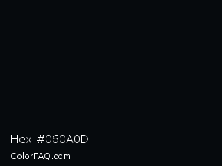 Hex #060a0d Color is a almost black blue color and the nearest color is Cod Gray #0b0b0b. Hex code #060a0d and RGB value is rgb(6,10,13). In RGB color space, this color is composed of 2% red, 4% green, 5% blue, In CMYK color space, this color is composed of 54% cyan, 23% magenta, 0% yellow , 95% black , In HSL color space, this color has a hue angle of 206° , 37% saturation and 4% lightness.